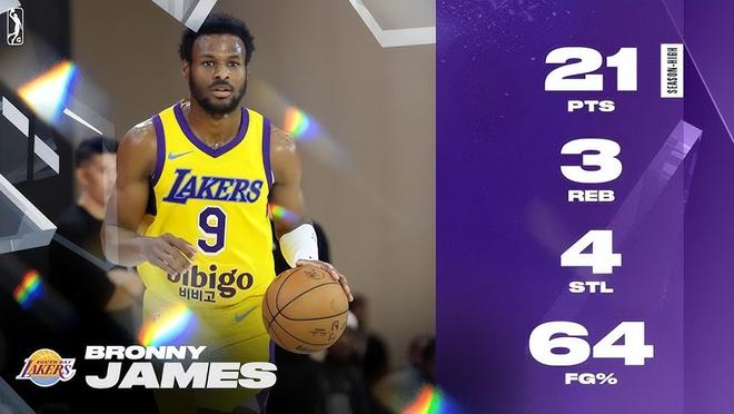 本场比赛中,被湖人下放到NBA发展联盟赛场进行锻炼的后场新星布朗尼-詹姆斯(Bronny James)的表现令人刮目相看。布朗尼全场出场29分钟,投篮14中9,三分线外6中2,罚球1中1,得到了21分3篮板2助攻4抢断的数据,还有3次失误和2次犯规,正负值更是达到了全场最高的+21。布朗尼在进攻端的表现还是相当不错的,布朗尼在进攻端展现出了全面的得分能力,他也是通过各种方式拿下了不少分数,起到了关键的作用。不仅如此,布朗尼在防守端的表现也是值得肯定的,他也同样发挥出了自己在防守端的作用,展现出了顶级防守大闸的实力。布朗尼在本场比赛中算是在攻防两端都发挥出了自己的价值,他在场上时球队的局面也是一片大好,这也是南湾湖人能够取得一场大胜的关键因素。